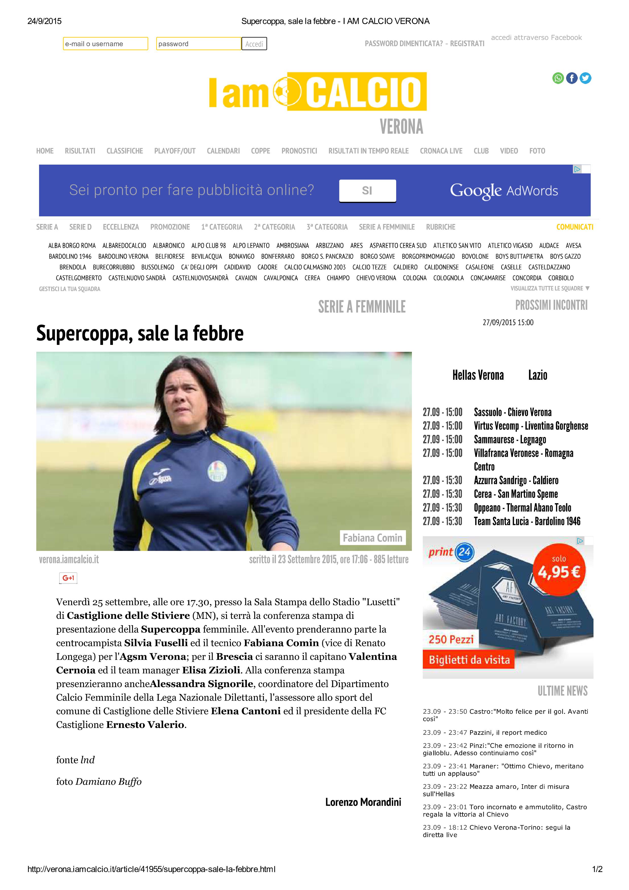 2015-09-23 – Supercoppa, sale la Febbre – Serie A Calcio Femminile Pubblicazione sul portale sportivo: I AM CALCIO VERONA Clicca sull’immagine per leggere l’articolo…